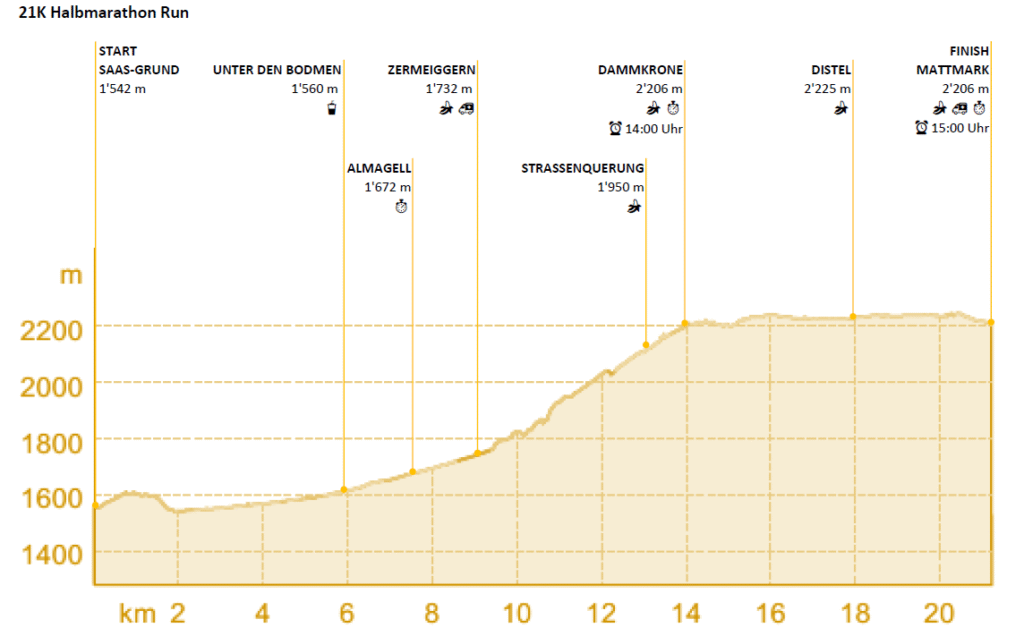 Der klassische Halbmarathon startet in Saas-Grund bei der Erlebnisbank Arena (Eishalle), führt dann durch herrliche Lärchenwälder vorbei an Saas-Grund und Almagell bis zum Weiler Zermeiggern. Auf historischen Wegen gelangt man in angenehm zu bewältigendem Anstieg auf die Staumauer. Schliesslich folgt der schönste Teil für die Läuferinnen und Läufer, die 7 Kilometer praktisch flache Runde um den malerischen Mattmarksee!