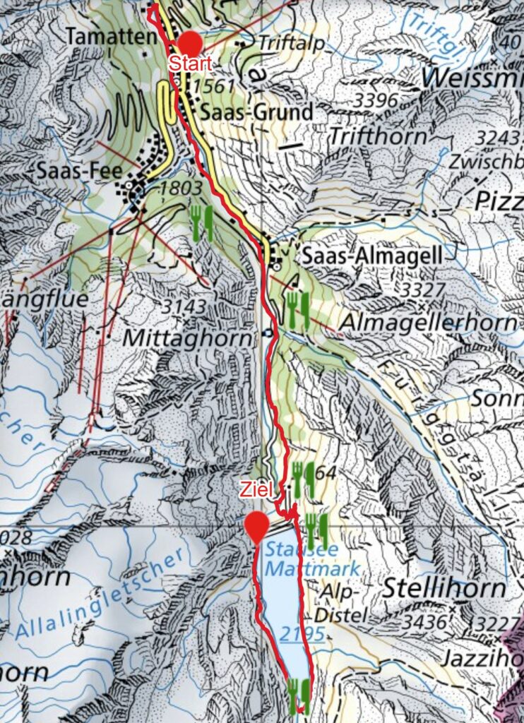 Saas-Grund / Erlebnisbank Arena – Bidermatten – Unter den Bodmen – Saas-Almagell – Zermeiggern – Staudamm – Distelalp – Mattmark