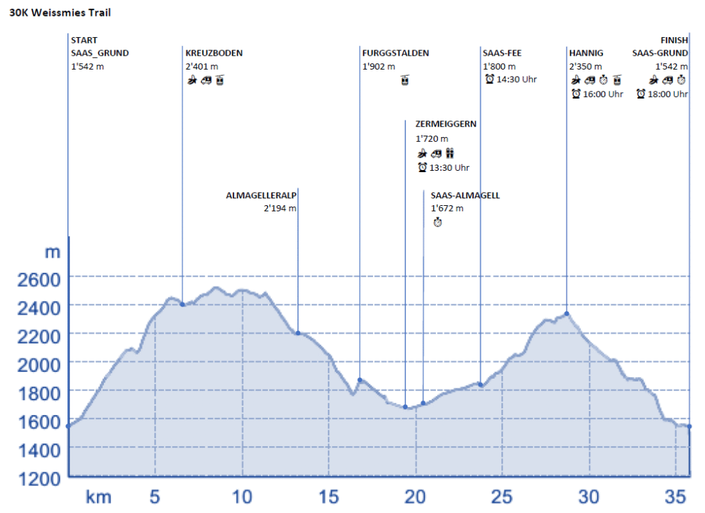 Der 30K findet auf alpinen Trails bis zu einer Höhe von 2750 müM statt. Jeder Teilnehmer muss sich der gewählten Rennlänge und des spezifischen Geländes bewusst sein, gut trainiert sein und alpine Erfahrung mitbringen.