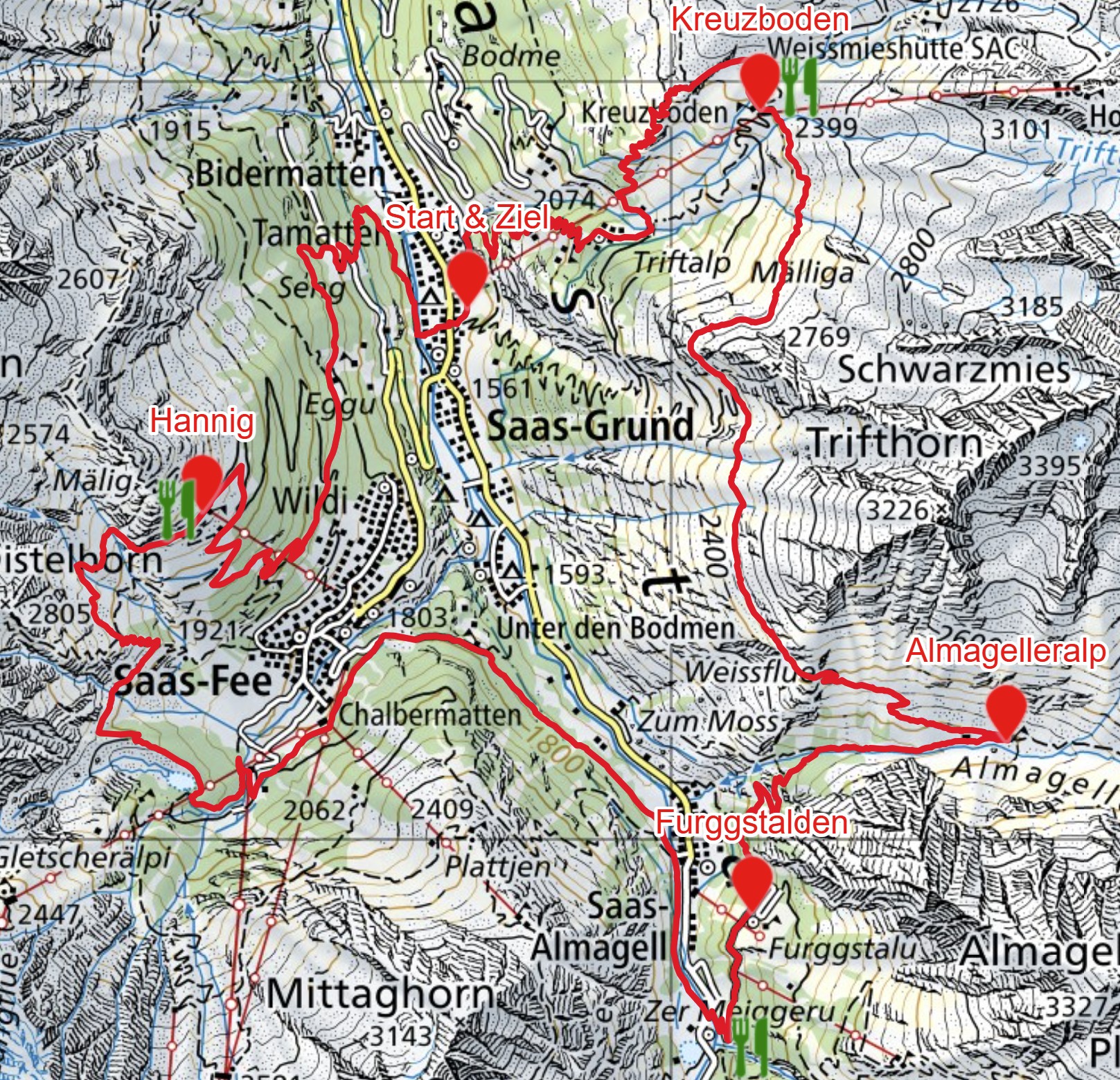 Saas-Grund / Erlebnisbank Arena – Kreuzboden – Almagelleralp – Saas-Almagell – Saas-Fee – Hannig – Sengg – Saas-Grund