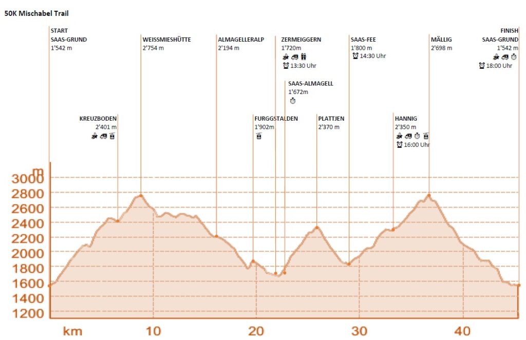 Der 50K findet auf alpinen Trails bis zu einer Höhe von 2750 müM statt. Jeder Teilnehmer muss sich der gewählten Rennlänge und des spezifischen Geländes bewusst sein, gut trainiert sein und alpine Erfahrung mitbringen.