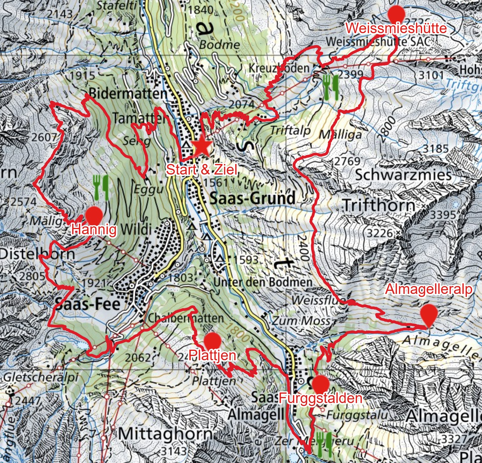 Saas-Grund / Erlebnisbank Arena – Kreuzboden – Weissmieshütte – Almagelleralp – Saas-Almagell – Plattjen – Saas-Fee – Hannig – Mällig – Sengg – Saas-Grund