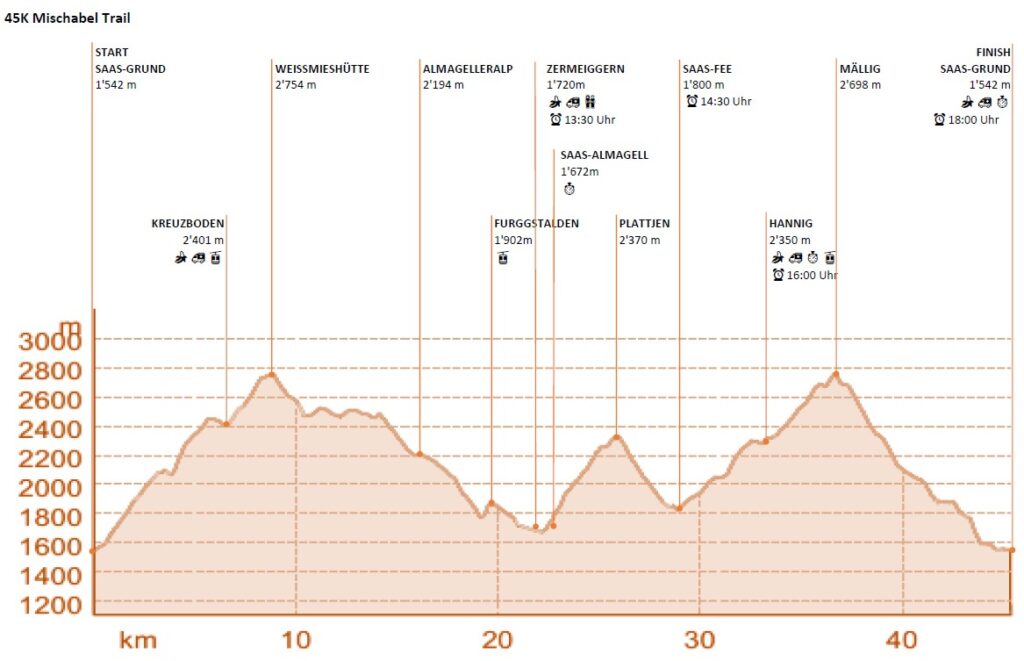 Der 45K findet auf alpinen Trails bis zu einer Höhe von 2750 müM statt. Jeder Teilnehmer muss sich der gewählten Rennlänge und des spezifischen Geländes bewusst sein, gut trainiert sein und alpine Erfahrung mitbringen.